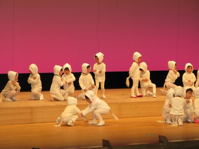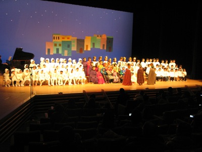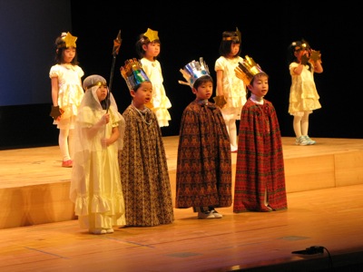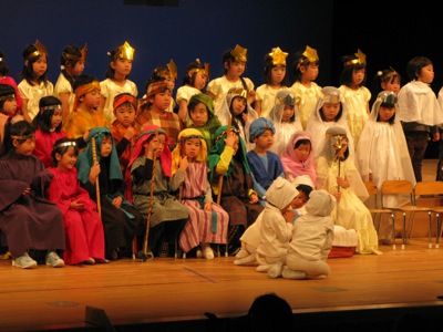 「いよいよ賛美歌が終わりました。陰アナウンサーの「以上で北見幼稚園の聖誕劇『世界ではじめのクリスマス』を終わります。」の言葉も流れ、緞帳が降りていきます。リポーターの私も何か感動しています。」
