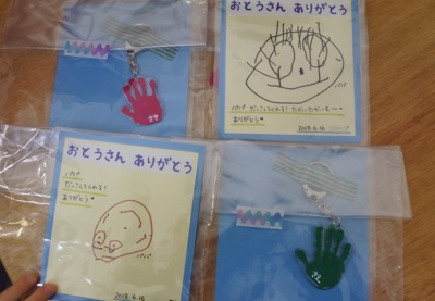 キーホルダーの完成です。お父さんの顔とメッセージも描きました。お父さん、カギとかカバンにつけてくれるかなー。