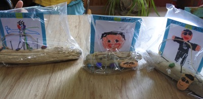 カードもつけて出来上がり。お父さん、カギかけてくれるかなー。(輪ゴムもかけれますよby年長担任)