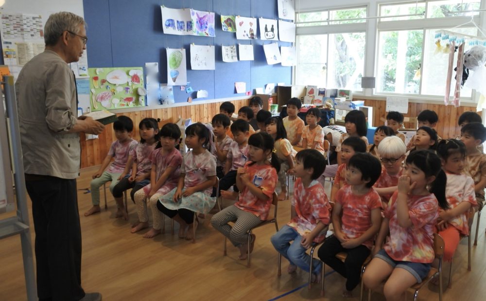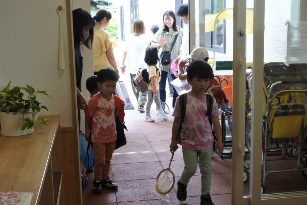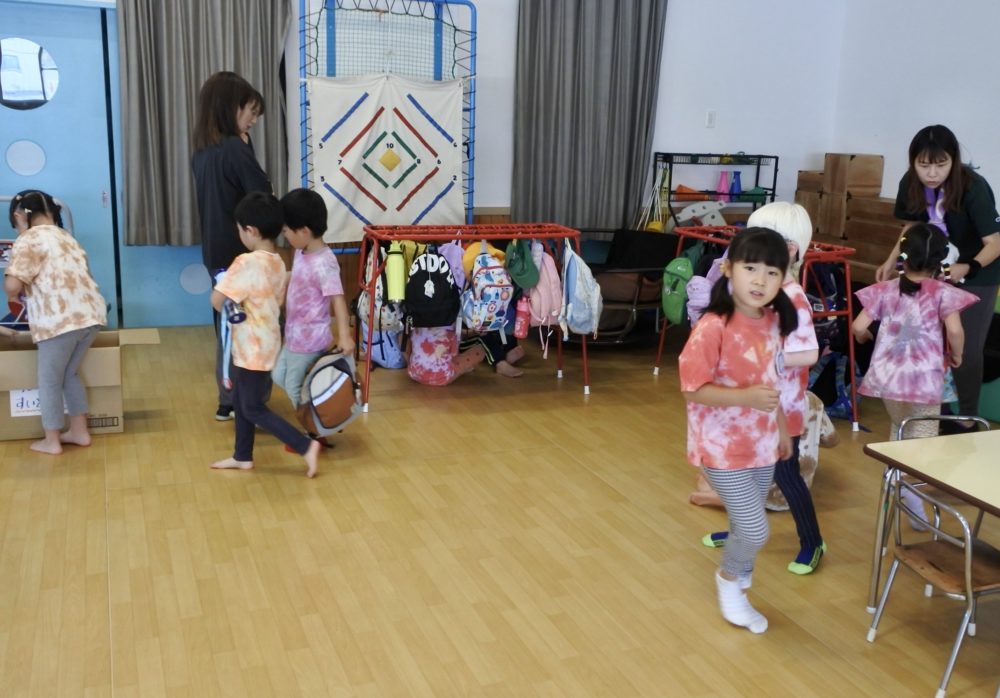 12時45分、年長組の子ども達が自分達で染めた素敵なTシャツを着て元気に登園してきました