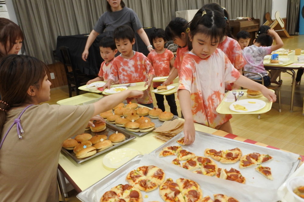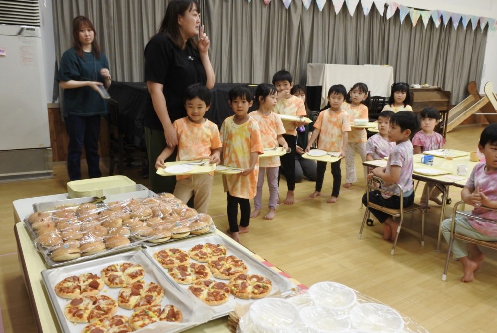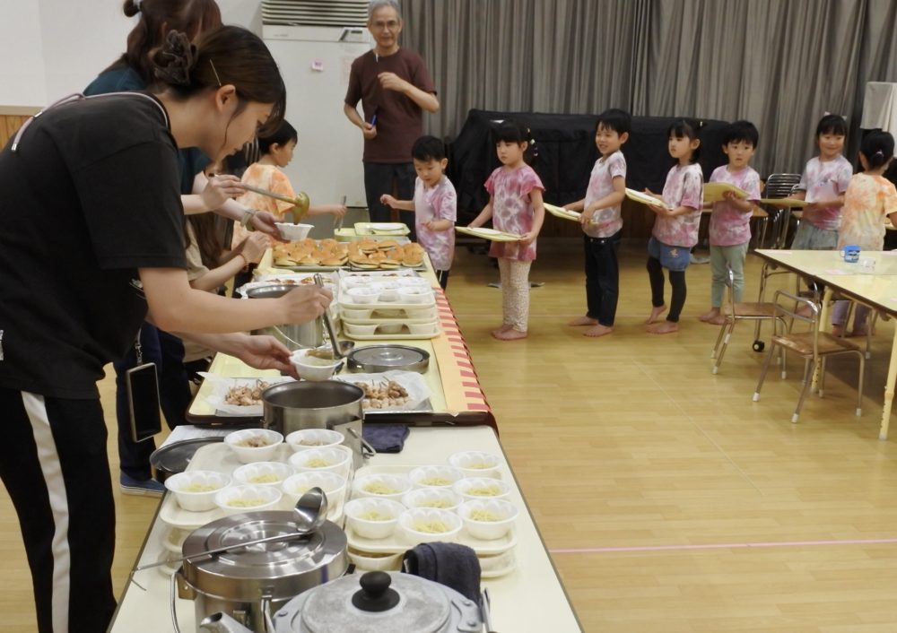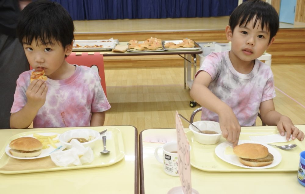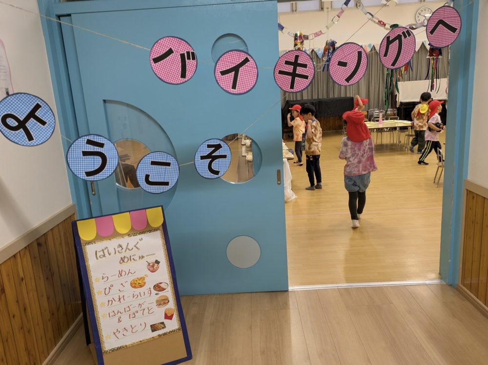 幼稚園に戻ると、ホールはバイキング会場になっていました