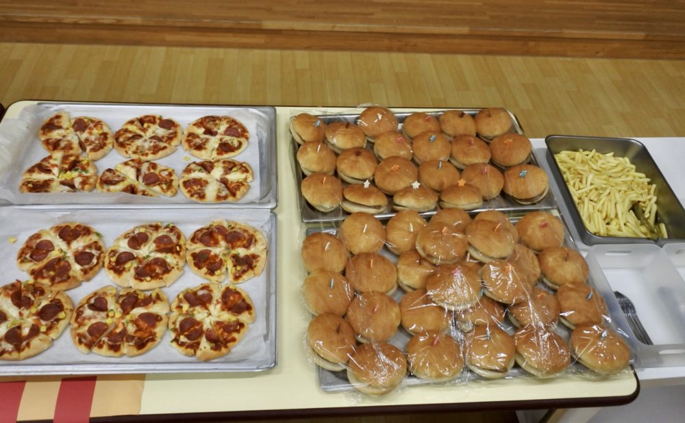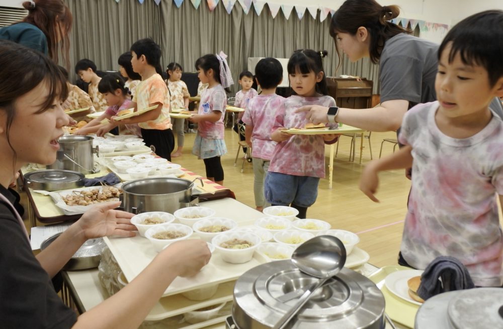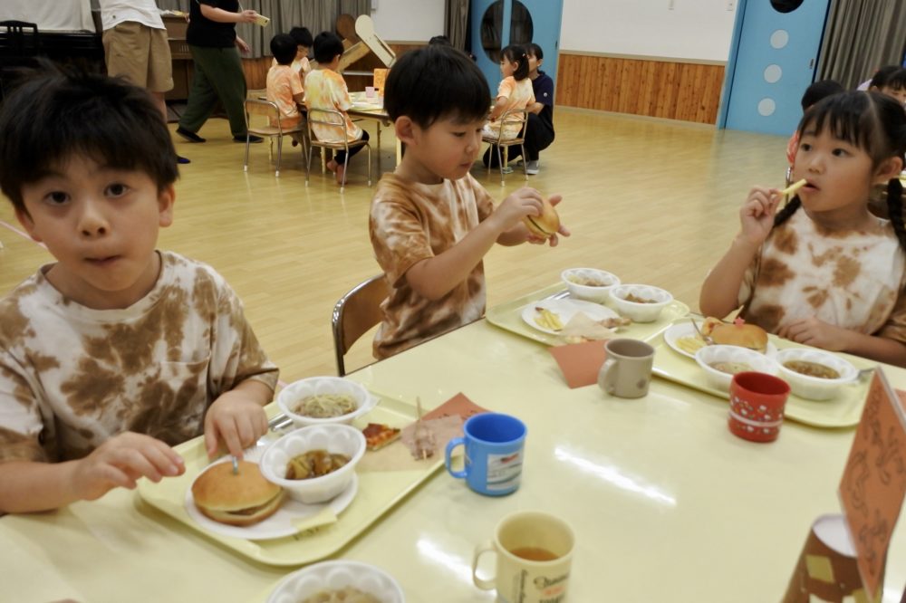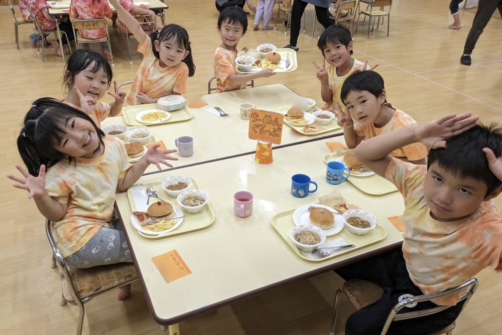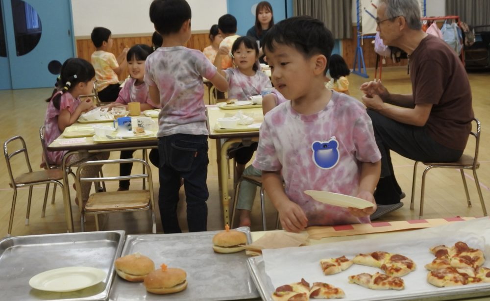 幼稚園に戻ると、ホールはバイキング会場になっていました