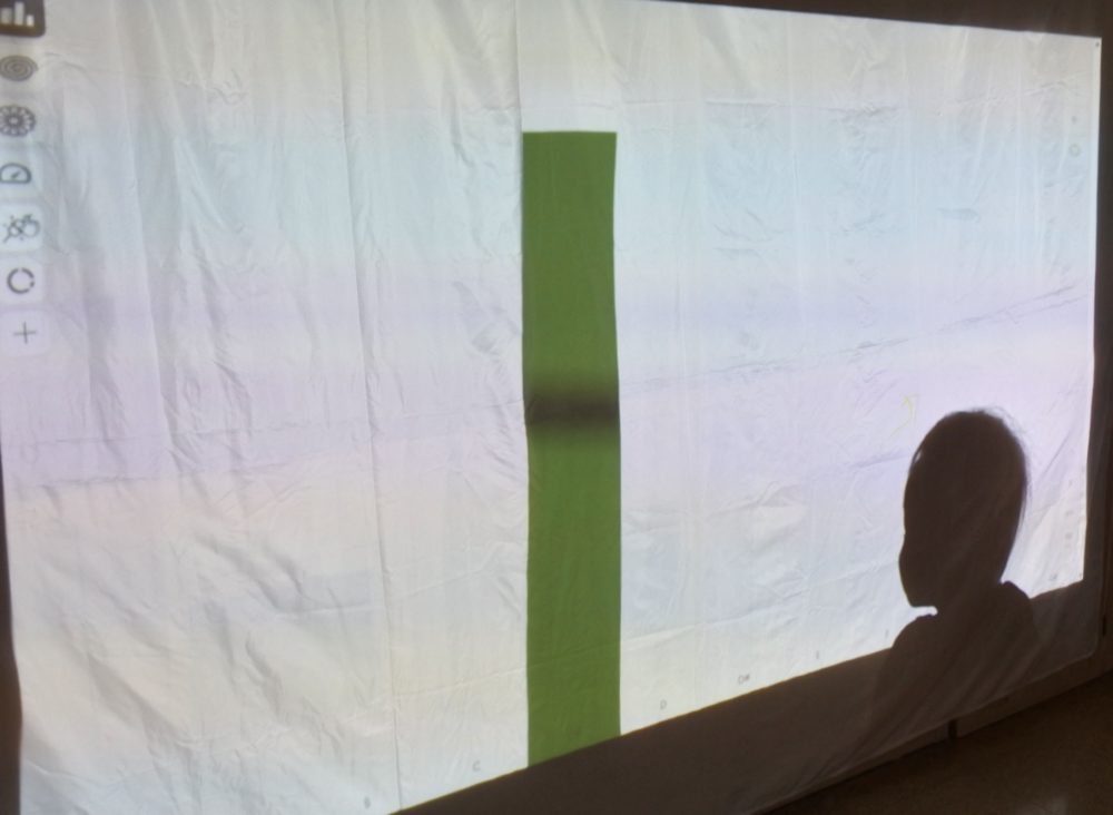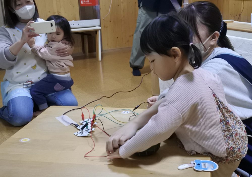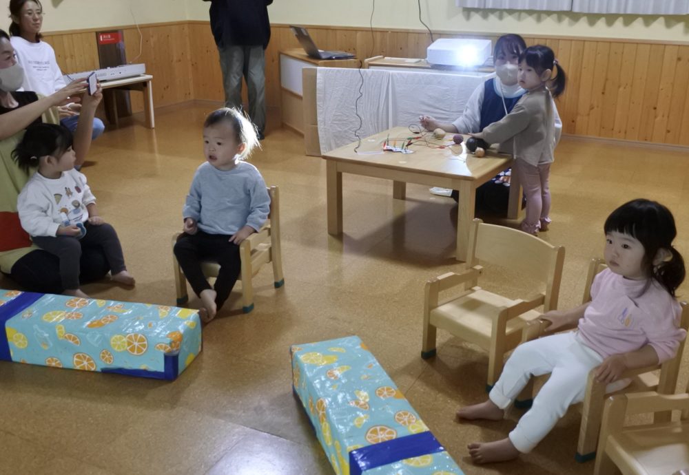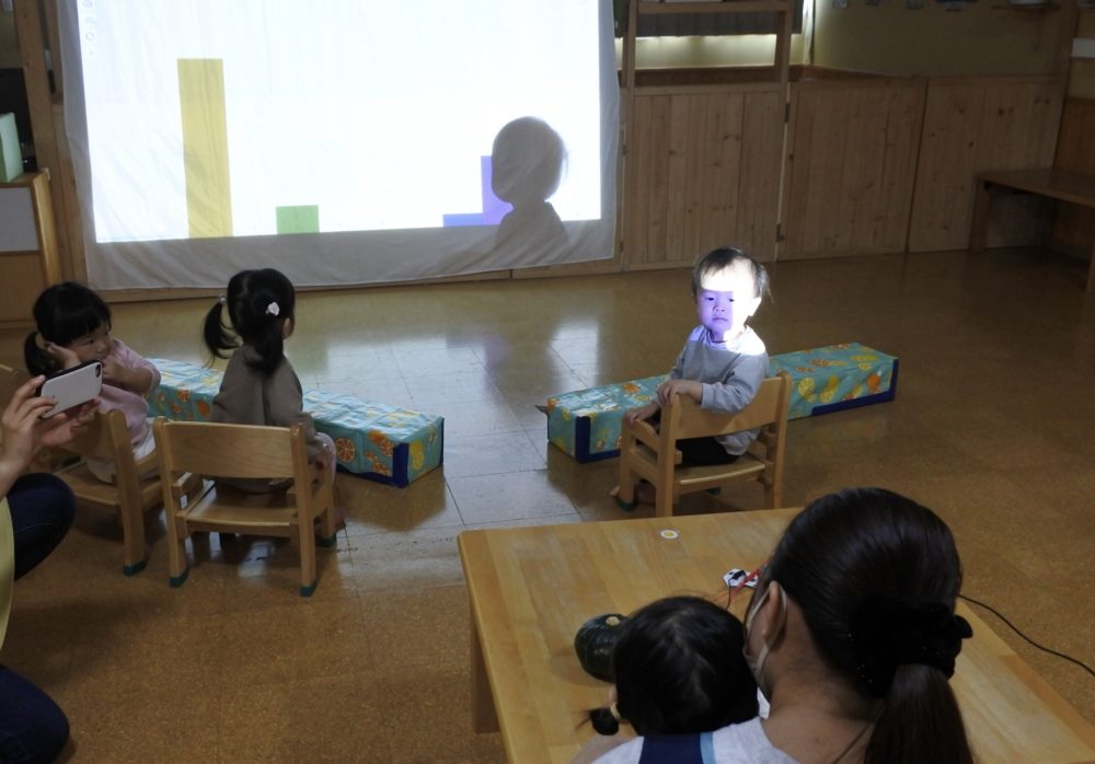 最初は音だけ聞いていましたが、野菜にタッチすると音が鳴り形が映し出されることがだんだんわかってきて、何度も野菜を触ってスクリーンを見て楽しんでいた子ども達です すごい👏