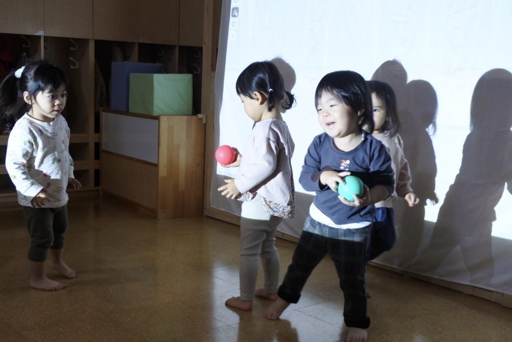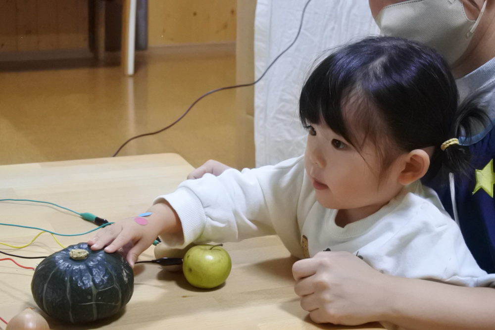 子ども達が、かぼちゃや、りんごを触ると音と一緒に丸い形がパッとあらわれます