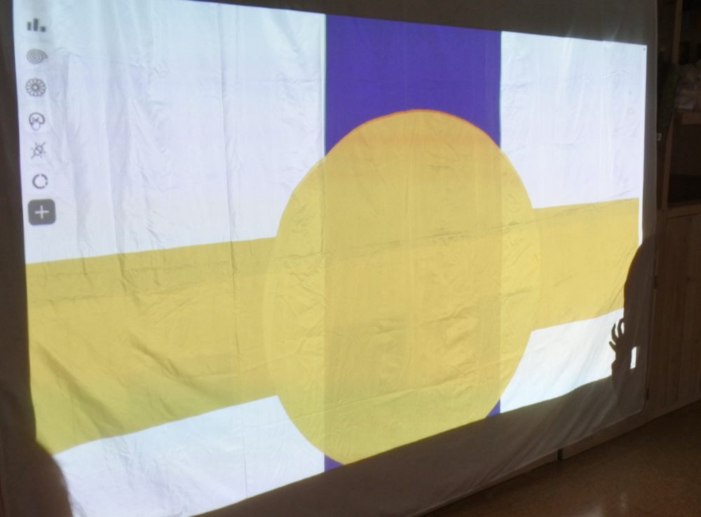 今日はもも組の子ども達が楽しみにしていた「音で遊ぼう♪」の日で、色々な楽器や音が形になって光として映し出されるのを楽しみました