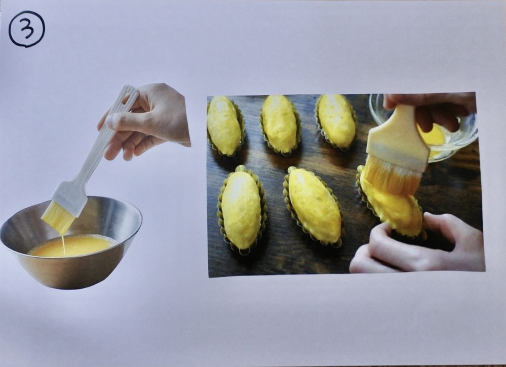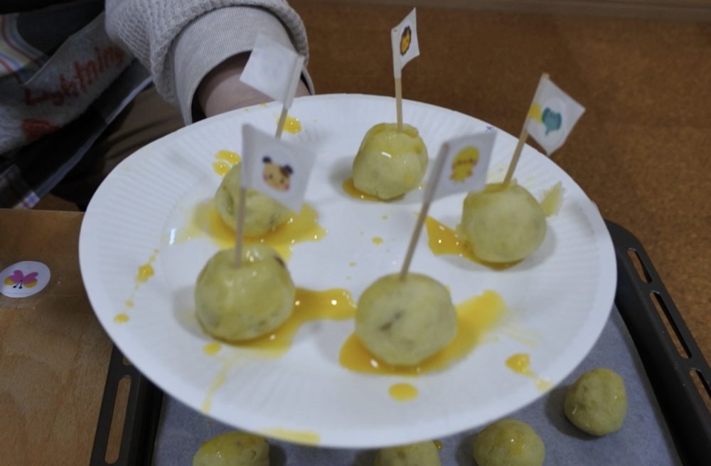 自分のシールの旗をたてて、これからオーブンで焼きます