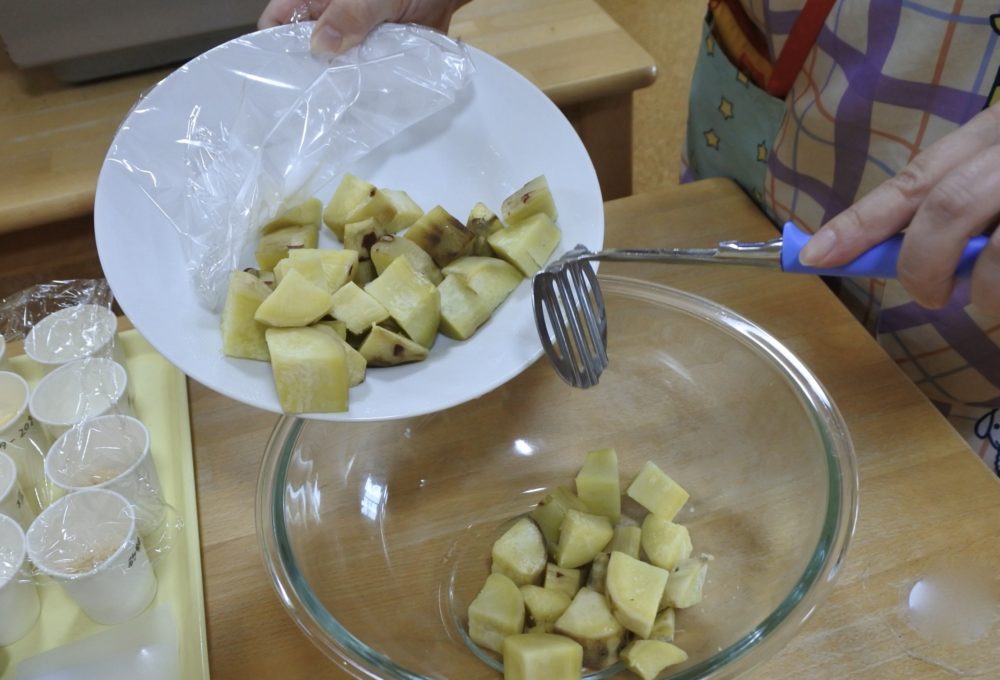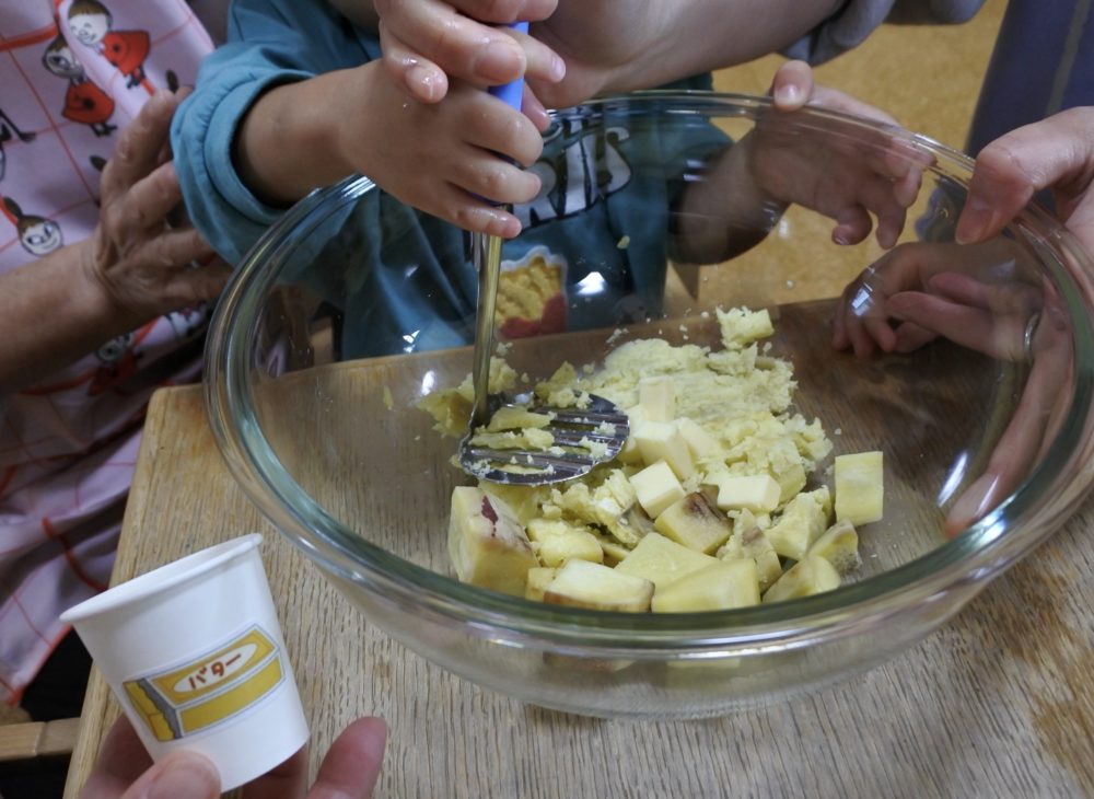 やわらかくなった、さつまいもをマッシャーでつぶします