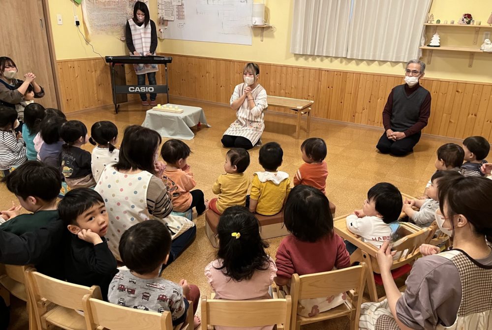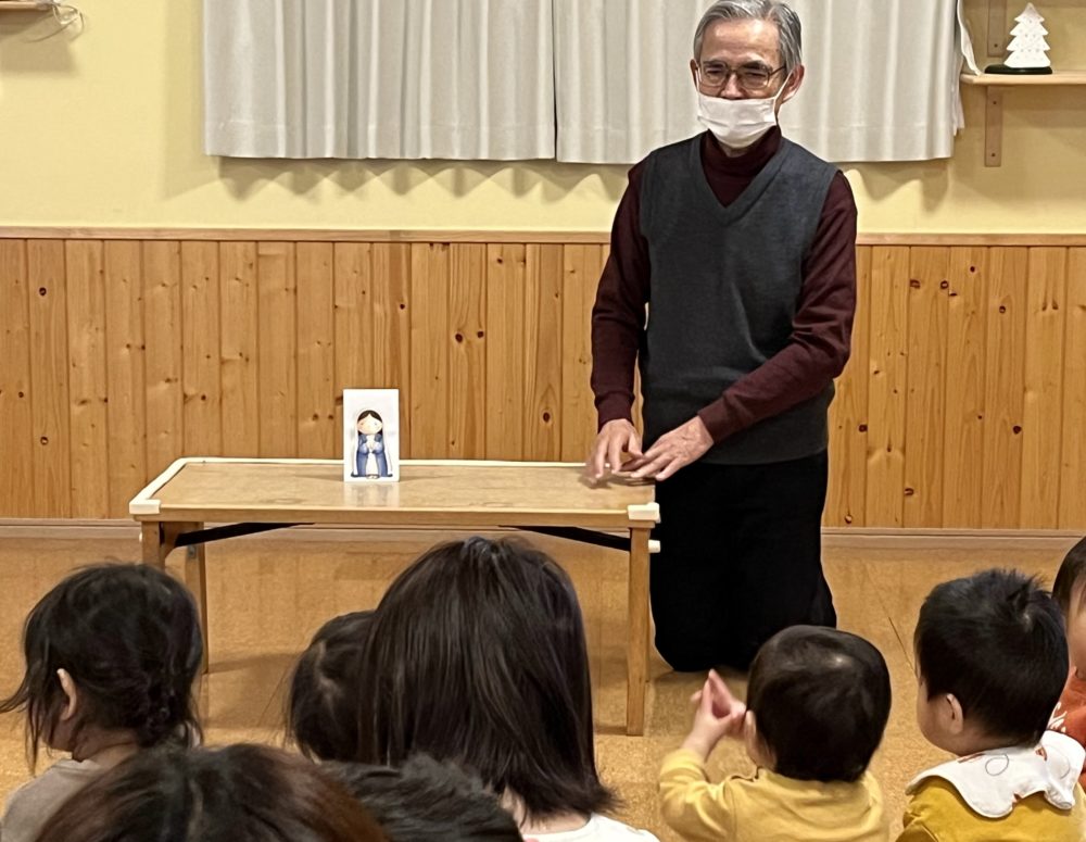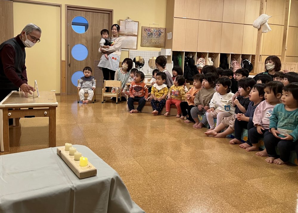 今日はもも組で園長先生からクリスマスのお話を聞き、アドベント1週目のお礼拝をお捧げしました