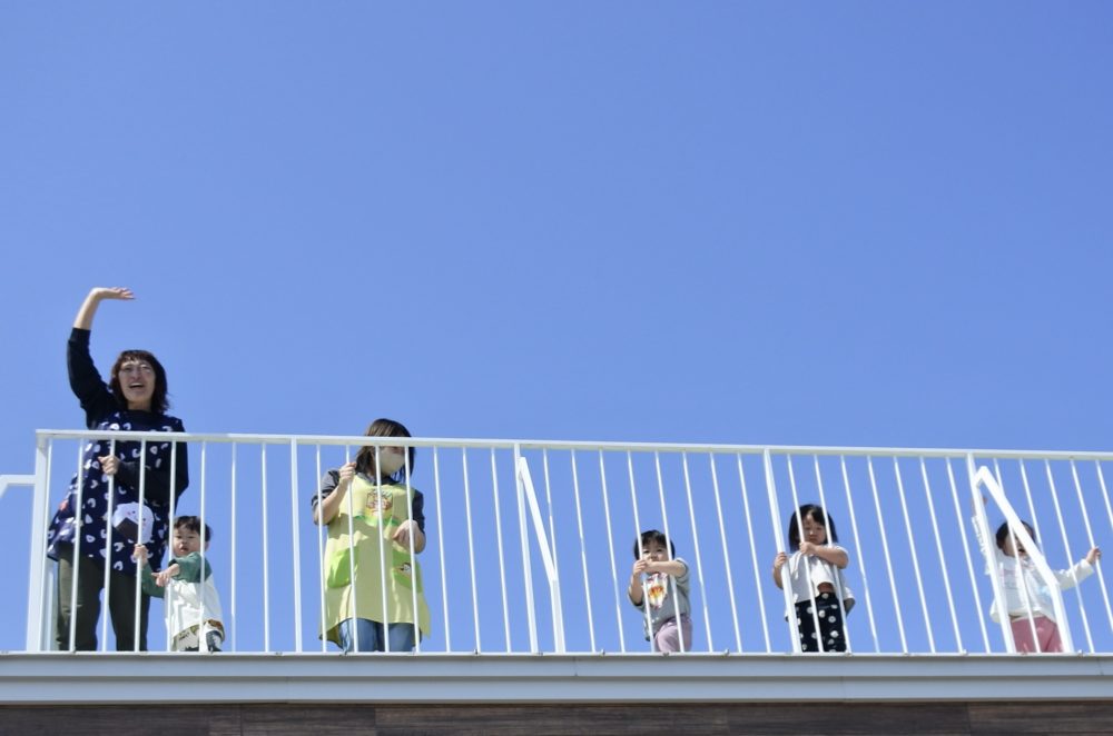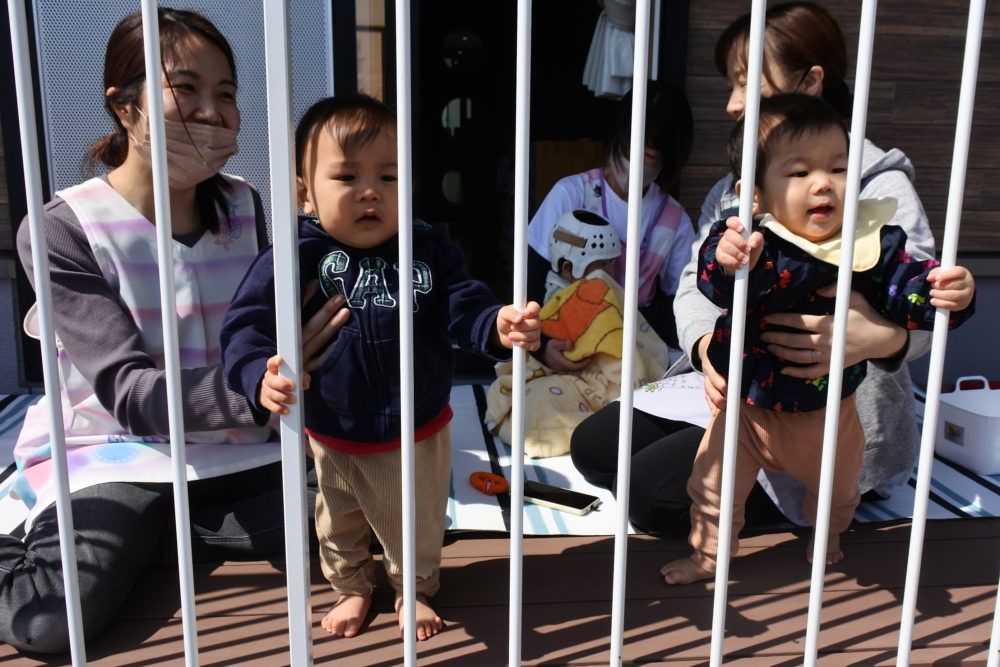 おやつの後は2階りんご組とベランダで遊びました。