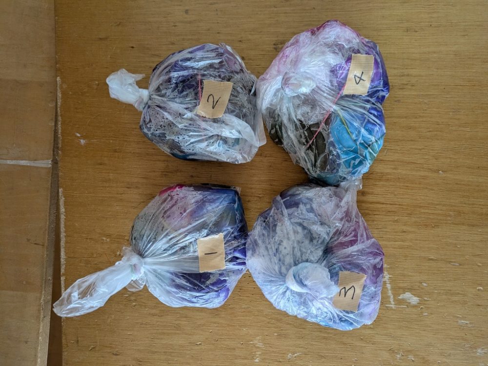 頭と尻尾の部分は、タイダイ染(布を中心からクルクルとねじって輪ゴムでとめて染料で染める方法)