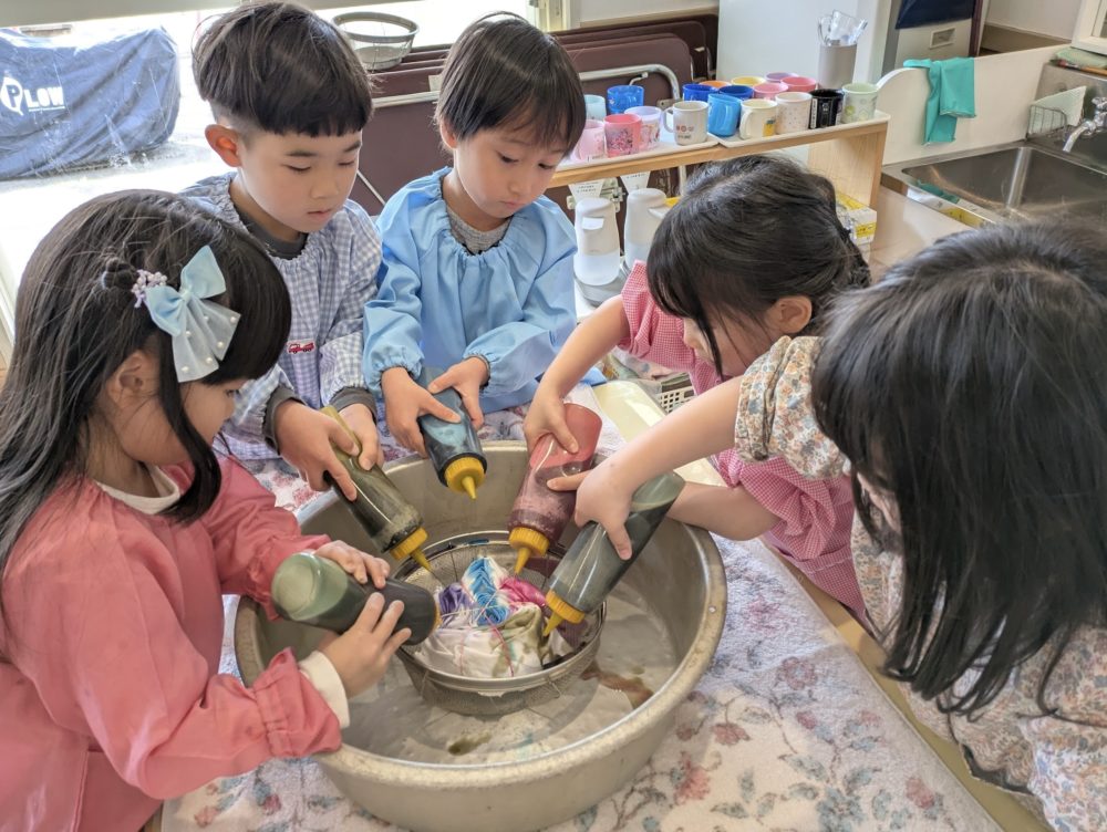 そこへ、みんなで話し合って決めた5色→紫、ピンク、黒、黄緑、水色の染料をかけます