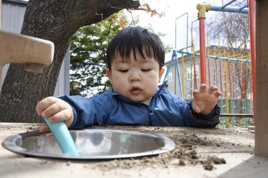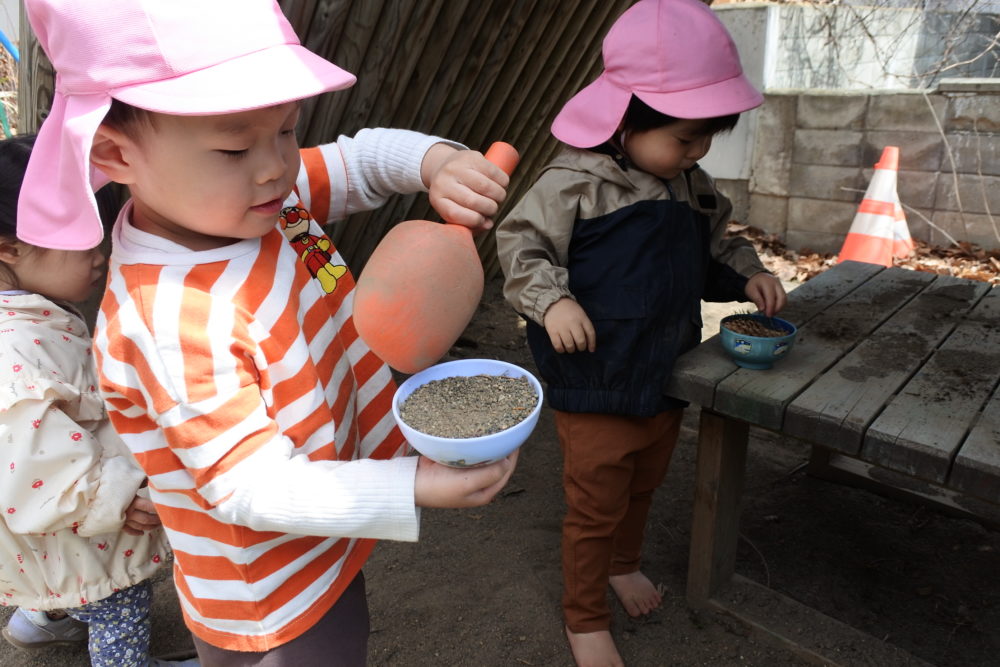 砂場でごちそう作りをしたり、さくらんぼのデッキに登ったりおりたり・・・たっぷり外遊びを楽しみました