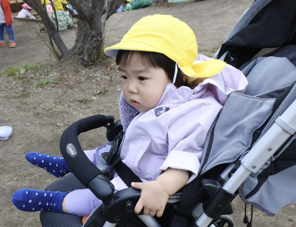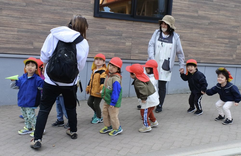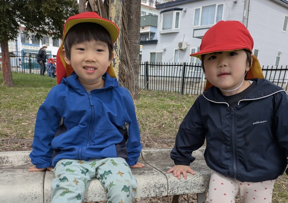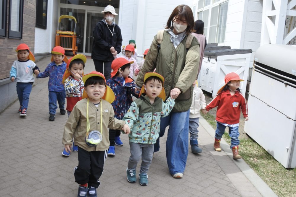 フルーツ・ばら組は園庭で遊び、年少ひよこ組・うさぎ組は近くのさいわい公園まで初めてのお散歩にお出かけしました