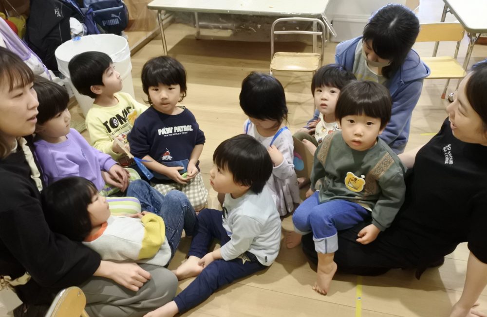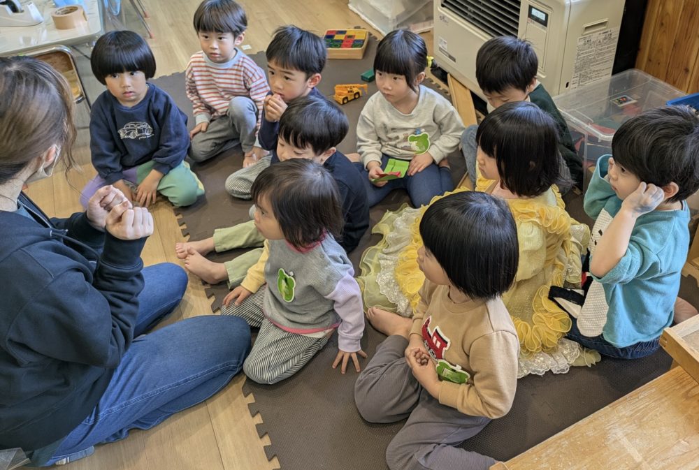 非常ベルの音を聞いて「これは何の音?」と静かになる子ども達、嬉しくなってピョンピョンとび跳ねる子ども達、少し怖くなって先生に抱っこされる子ども達、すぐに先生のそばに行って座る子ども達・・・と色々な子ども達がいましたが、非常ベルの音を聞いた後、どのクラスも先生のお話をよ〜く聞くことができました